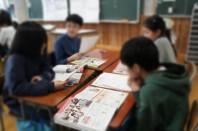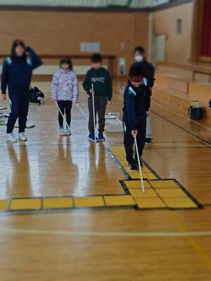 4年生全員が、アイマスクと白杖、介助の体験をしました。温かい声がけが、とても上手でした。