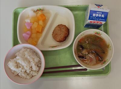 とうふの日給食です。岩手県産とうふと海藻のスープ、アロニア豆乳クリームだいふく😋