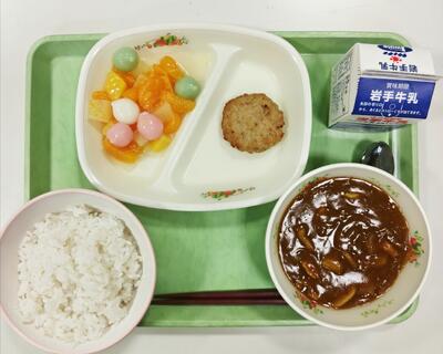 月曜からカレーが食べられるなんて♥かみかみ給食です。カレーが飲み物にならないように、れんこんをかみかみしますね。